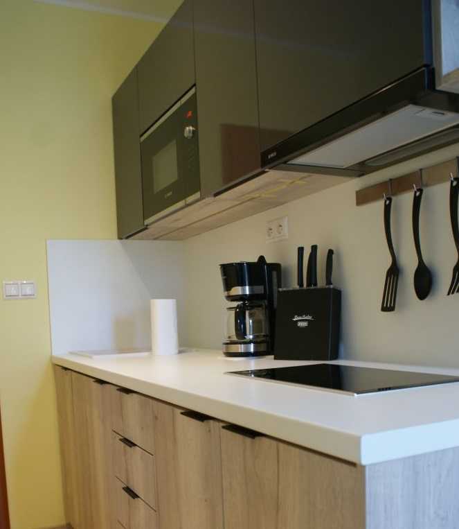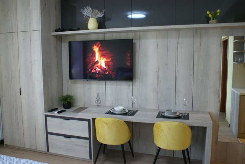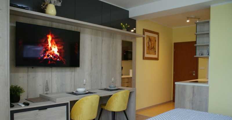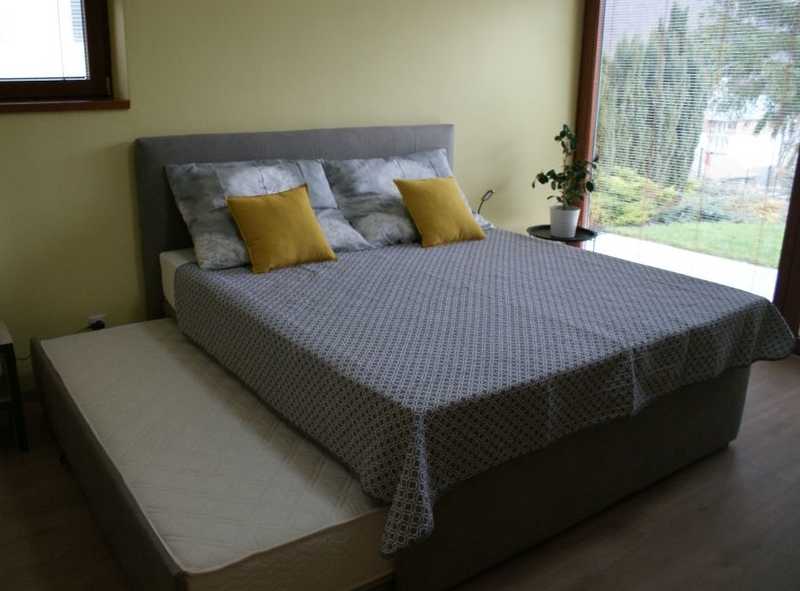 Apartmán vyššieho, hotelového štandardu. Hotelová čalúnená posteľ maximalnej šírky a zvýšenej výšky. Prístelka je posteľ vysúvajúca sa s pod postele s matracom šírky 80cm.